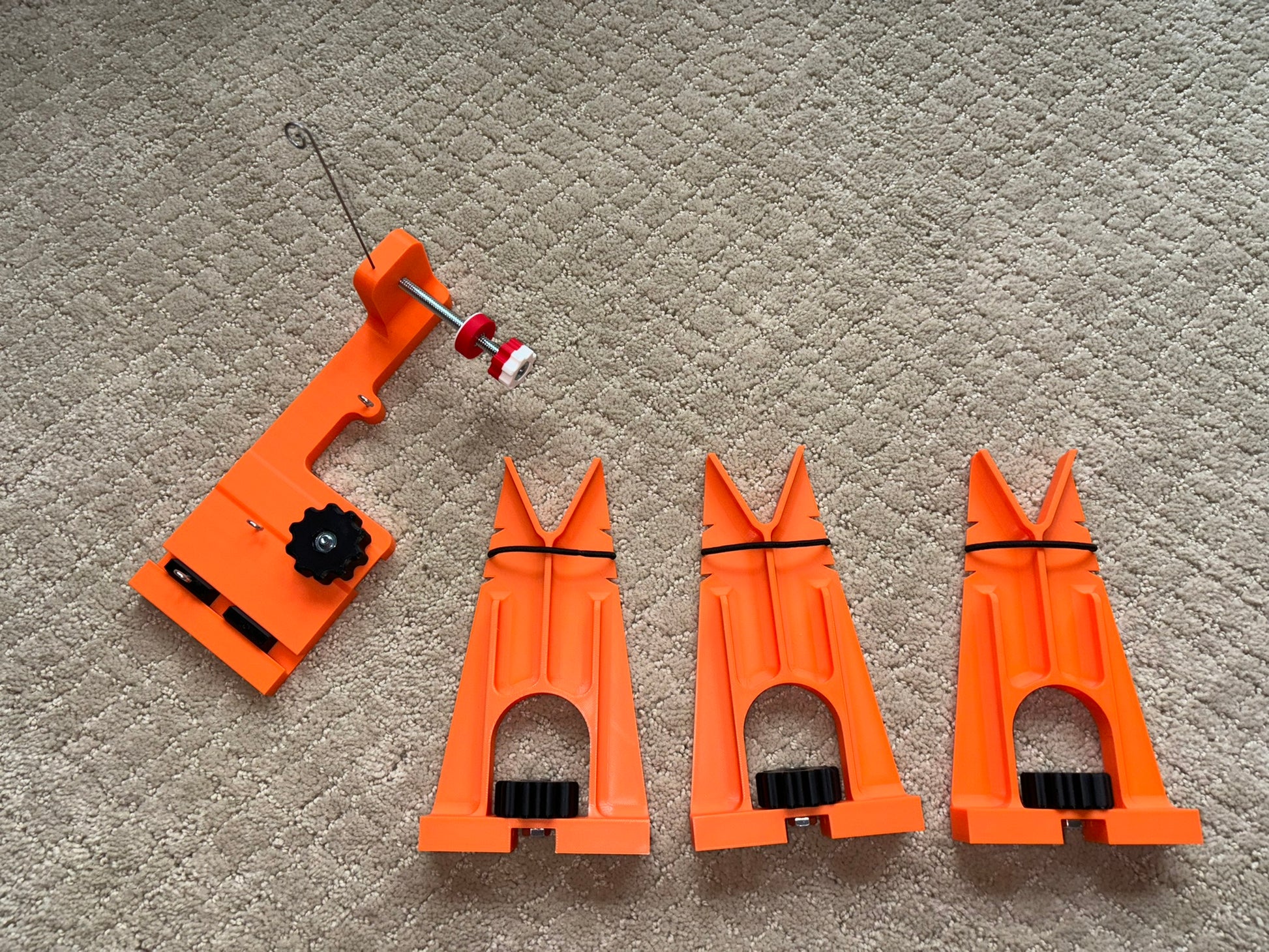 Each kit contains: 3 rod support stands with bands to secure your rod, 1 thread carriage for single spool, 1 slide with hook, 1 spare slide, 1 set thread tension magnets, 1 steel tension arm, and all necessary hardware pictured.